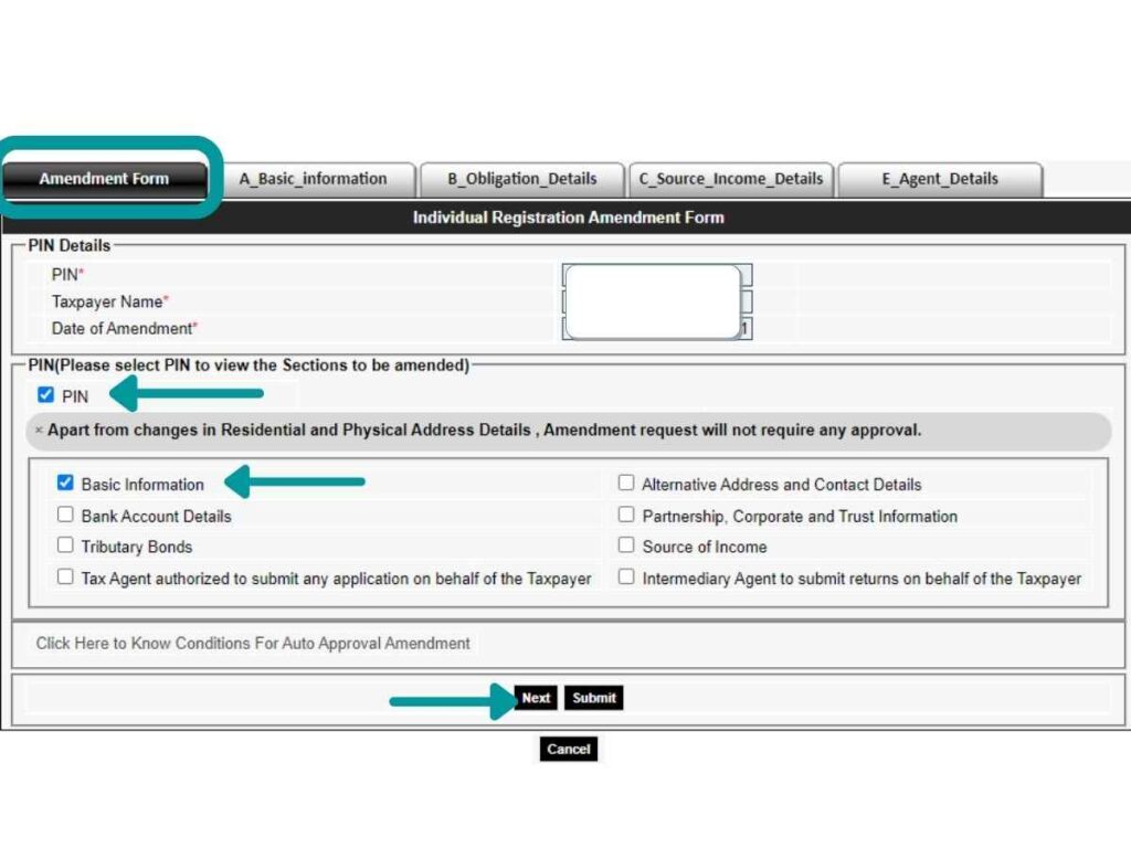 Under the Amendment Form tab, tick the PIN and Basic Information boxes. Then click Next.