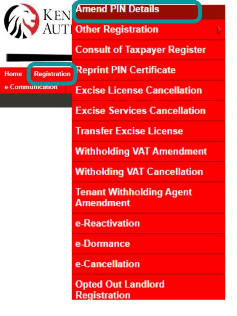 But if the details in your KRA account like P.O. Box and Zip code are actually outdated, or you want to solve the date issue, you may update them by clicking Registration, then Amend PIN Details from the pop-up list.
